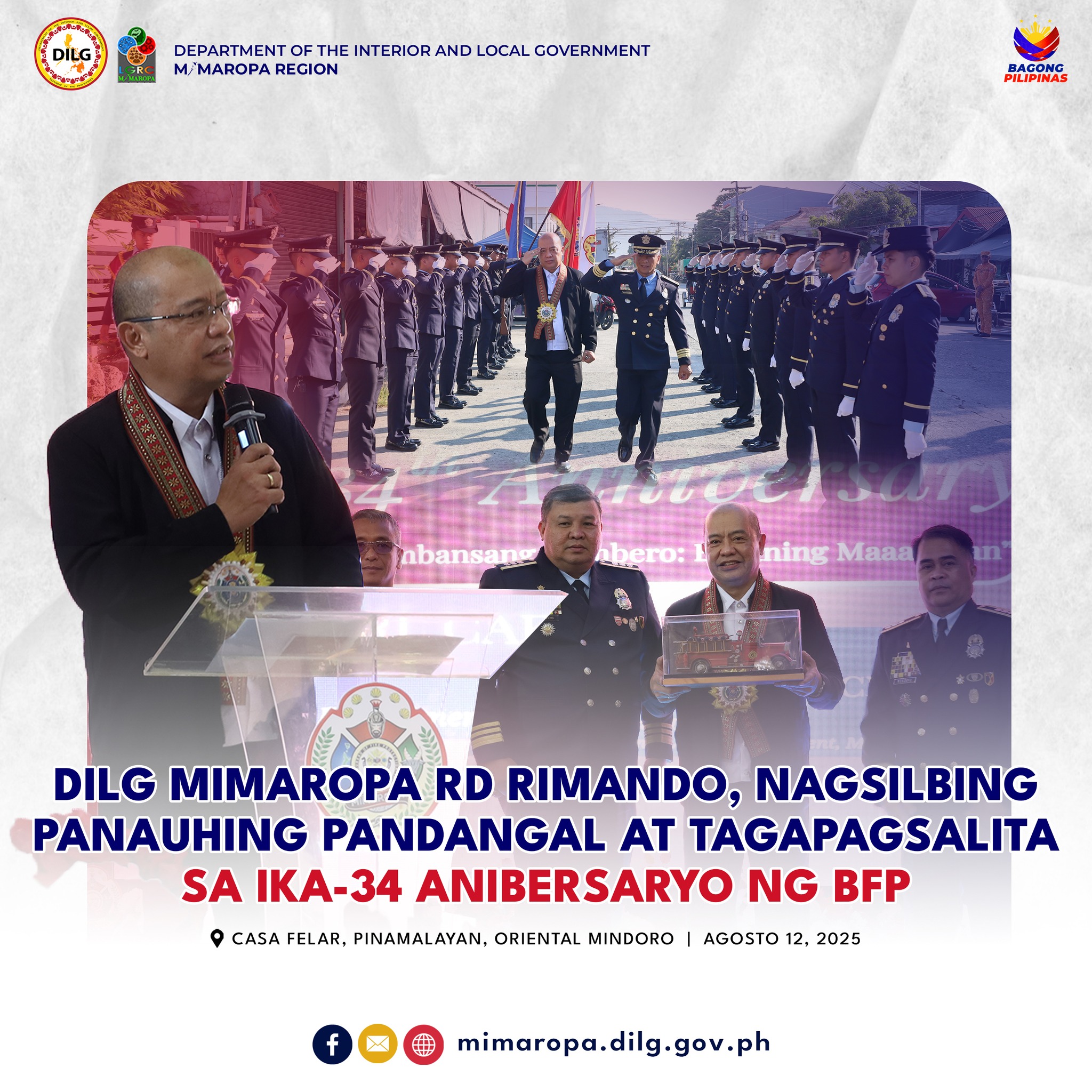Nagsilbing Panauhing Pandangal at Tagapagsalita si Regional Director Karl Caesar Rimando, CESO III sa ika-34 Taong Anibersaryo ng Bureau of Fire Protection (BFP) na isinagawa sa Casa Felar, Pinamalayan, Oriental Mindoro nitong Martes, Agosto 12.