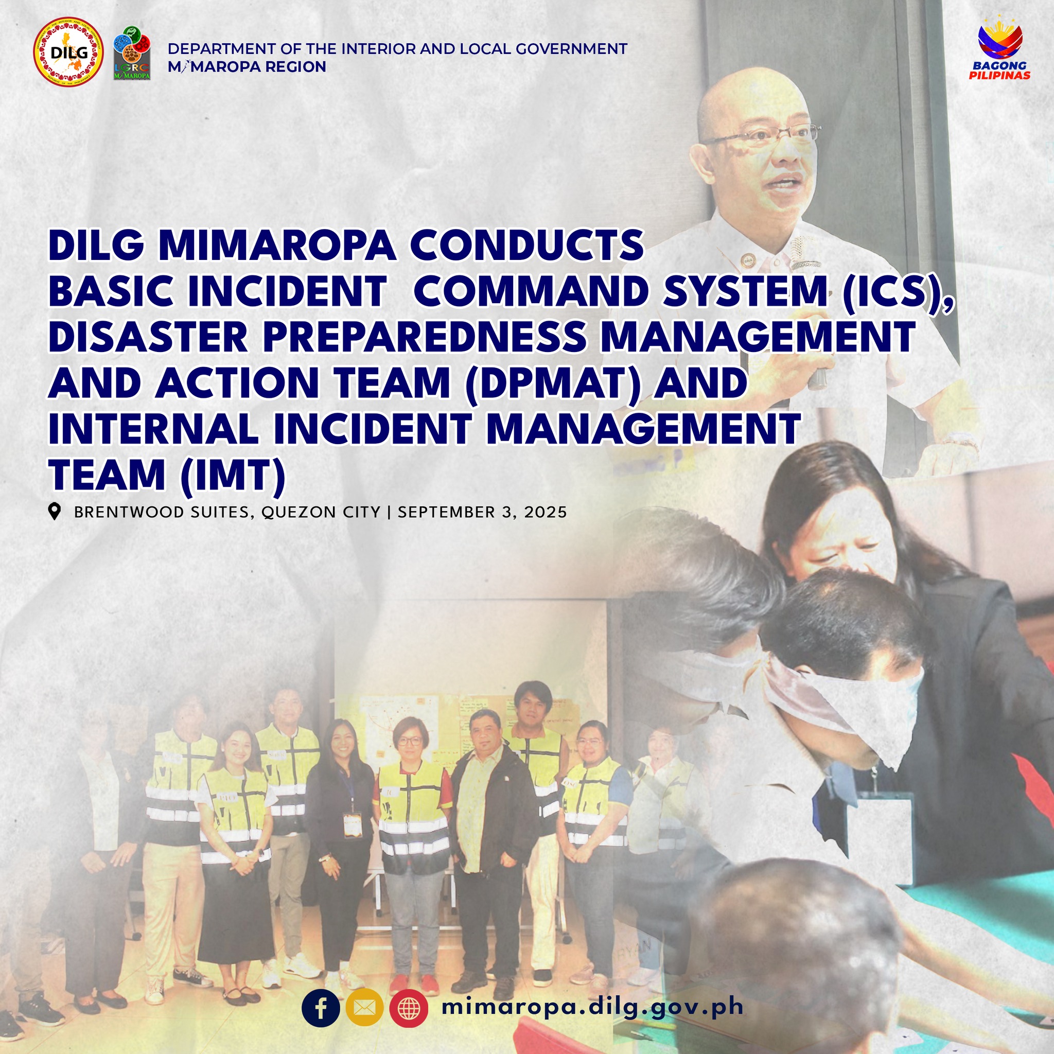 The Department of the Interior and Local Government (DILG) MIMAROPA successfully conducted the Basic Incident Command System (ICS) Training for its Disaster Preparedness Management and Action Team (DPMAT) and assigned Internal Incident Management Team (IMT) Members last September 3–5, 2025 at Brentwood Suites, Quezon City.